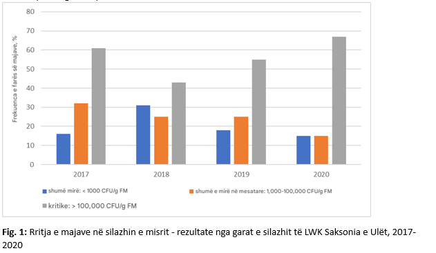 Valët e nxehta të viteve të fundit kanë nxitur fuqishëm rritjen e pakontrolluar të majave dhe mykut, veçanërisht në silazhin e misrit të patrajtuar. Kjo u bë e qartë në vlerësimin e Konkurrencës së Silazhit (SWB) 2020 të Dhomës së Bujqësisë së Saksonisë së Ulët. Më shumë se dy të tretat e silazheve të misrit pjesëmarrës treguan vlera në intervalin kritik prej më shumë se 100,000 njësi formuese kolonish (CFU)/g masë e freskët (FM) dhe kështu shenja të qarta të prishjes. Vitet e mëparshme të vlerësimit tregojnë gjithashtu këtë rritje të ndotjes së majave dhe sugjerojnë një kontaminim dukshëm më të lartë në bimën e misrit (shih Figurën 1).