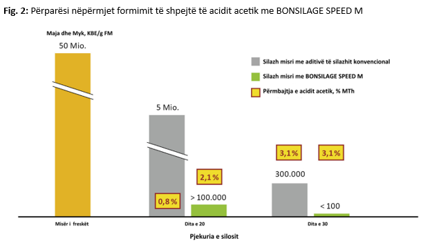 Lloji i baktereve të acidit laktik Lactobacillus diolivorans që përmbahet në BONSILAGE SPEED M prodhon acid acetik shumë shpejt dhe kështu pengon përhapjen e majave dhe mykut brenda 14 ditëve të para të periudhës së fermentimit të silazhit (shih Figurën 2). Kjo do të thotë që silazhi i misrit të trajtuar mund të hapet pas vetëm 14 ditësh. Përveç kësaj, sasi më të mëdha të acidit propionik formohen me rritjen e kohës së fermentimit të silazhit. Acidi propionik ka një efekt ruajtës dhe mbështet stabilitetin aerobik të silazhit të misrit të hapur.