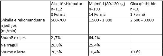 Shpërndarja e sasisë së rrjedhës së ujit të matur. Për derrat për majmëri, janë marrë në konsideratë vlerat e rekomanduara për fazën e fundit të majmërisë. Nëse matjet do të ishin kryer në fazën e mesme të majmërisë, edhe më shumë ferma do të kishin rezultuar me shkallë rrjedhjeje të ujit më të lartë se e rekomanduara.