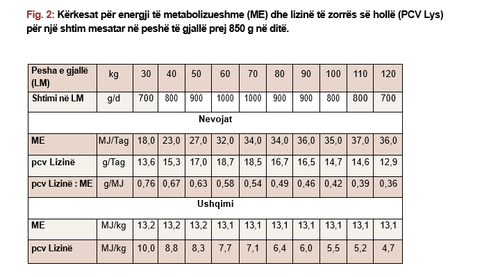 GfE e ka ndarë intervalin e masës trupore prej 30 deri në 120 kg në rritje nga 10 kg masë trupore dhe në nivele performance prej 500 deri në 1.100 g shtim në peshë të gjallë çdo ditë. Nëse shtimi ditor i masës trupore brenda një faze të masës trupore rritet me 100 g, atëherë te derrat për majmëri me një përqindje normale të mishit pa dhjamë duhet të shtohen çdo ditë rreth 1,8 g lizinë e tretshme shtesë. Te derrat me përqindje të lartë mishi pa dhjamë kjo rritje është edhe më e lartë me afërsisht 2.0 g lizinë të tretshme në ditë. Edhe raporti i aminoacideve kryesore ndaj lizinës është përshtatur. Në bazë të aminoacideve të tretshme, raporti i metioninës+cistinës ndaj lizinës është ulur, ndërsa ai i treoninës është rritur. Kërkesa për energji rritet vazhdimisht me rritjen e performancës së majmërisë. Në fazën e parë të majmërisë (30–60 kg LM) janë 2 MJ ME në ditë dhe në fazën e mesme/finale të majmërisë (60–120 kg LM) janë 3 MJ ME në ditë, të cilat duhet të shtohen kur shtimi ditor i masës trupore rritet me 100 g. Për shpenzimin e energjisë për kg shtim në masë trupore, shihet një efikasitet më i mirë me rritje më të larta. Për një shtim mesatar ditor të masës trupore prej 850 g, duhet parashikuar një shpenzim energjie prej rreth 37 MJ/kg shtim gjatë gjithë periudhës së majmërisë (shih Fig. 2).
