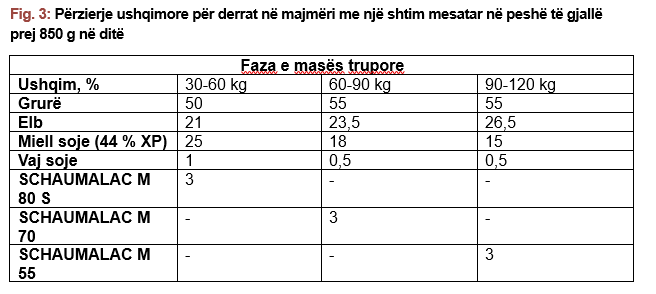 Përqendrimet e lëndëve ushqyese dhe përbërësve aktivë të programit Schaumann bazuar në nevojat konfirmojnë se performanca optimale e majmërisë dhe therjes arrihet me llogaritjet e racioneve të rekomanduara. Derrat për majmëri marrin sasi të mëdha të aminoacideve esenciale përmes ushqimit mineral Schaumann. Ato plotësojnë boshllëqet në kërkesat për proteina të ushqimit dhe treten plotësisht. Siç tregojnë përzierjet e mostrave në Figurën 3, rekomandimet më të fundit të Shoqërisë për Fiziologjinë e Ushqyerjes merren në konsideratë në mënyrë gjithëpërfshirëse.